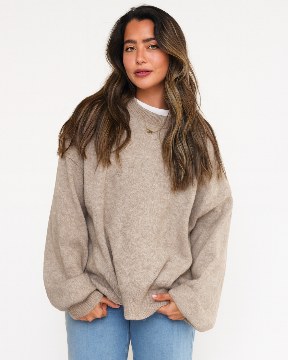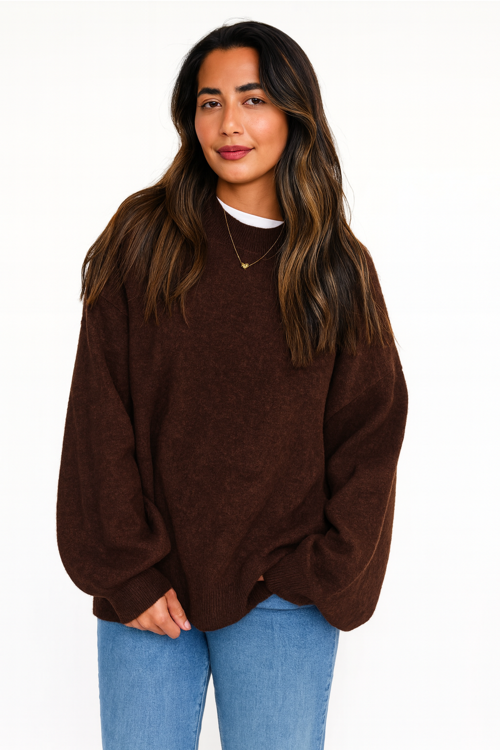 Ten luźny sweter z obniżoną linią ramion i rozcięciem u dołu pięknie układa się na sylwetce, podkreślając jej naturalny kształt. Delikatnie elastyczna dzianina zapewnia wygodę i swobodę ruchów, idealną na co dzień lub weekendowy relaks.